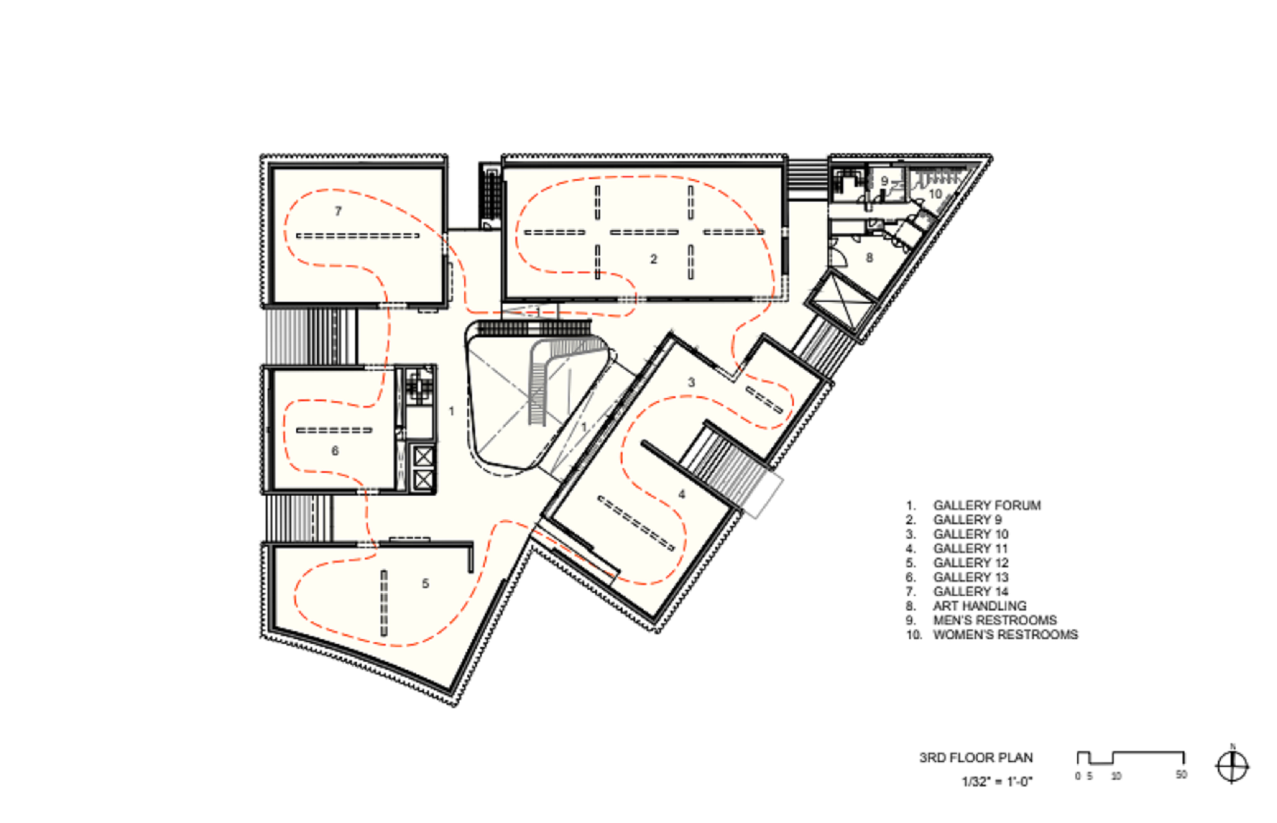 ギャラリーからギャラリーへの移動は、植物用のトレリスでグレアーを抑えた7つのガーデンへの景色で分割される。ギャラリー群は、オープン・フォーラムの周囲に展開されている。この中央フォーラムはアート・エキジビション用の広い空間であり、上階への垂直動線にもなっている。