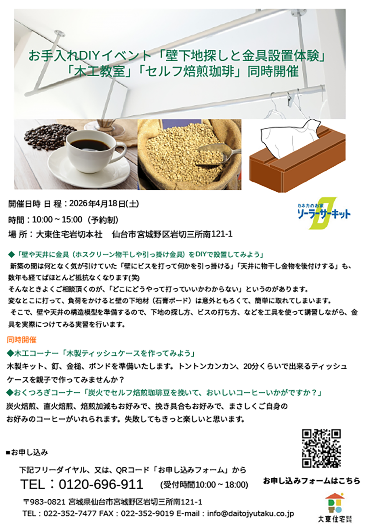 イベントお手入れDIYイベント「壁下地探しと金具設置体験」「木工教室」「セルフ焙煎珈琲」同時開催
