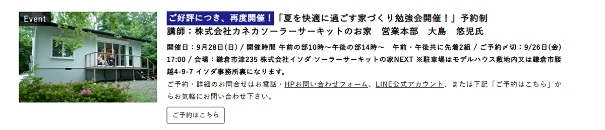 開催場所:鎌倉市津235 株式会社イソダ ソーラーサーキットの家NEXT